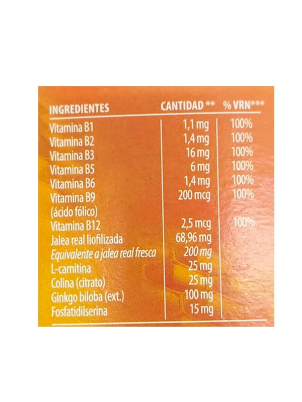 Agua; extracto de frutas (algarroba, uva y manzana); extracto fluido de hojas de ginkgo (Ginkgo biloba); jalea real liofilizada; nicotinamida (niacina); aroma de mandarina; L-carnitina; citrato de colina; acidulante; ácido cítrico; conservante: sorbato potásico; D-pantotenato cálcico (ácido pantoténico); fosfatidilserina; clorhidrato de piridoxina (vitamina B6); riboflavina (vitamina B2); clorhidrato de tiamina (vitamina B1); estabilizante: sucroéster de ácidos grasos; ácido pteroilmonoglutámico (folato); cianocobalamina (vitamina B12).