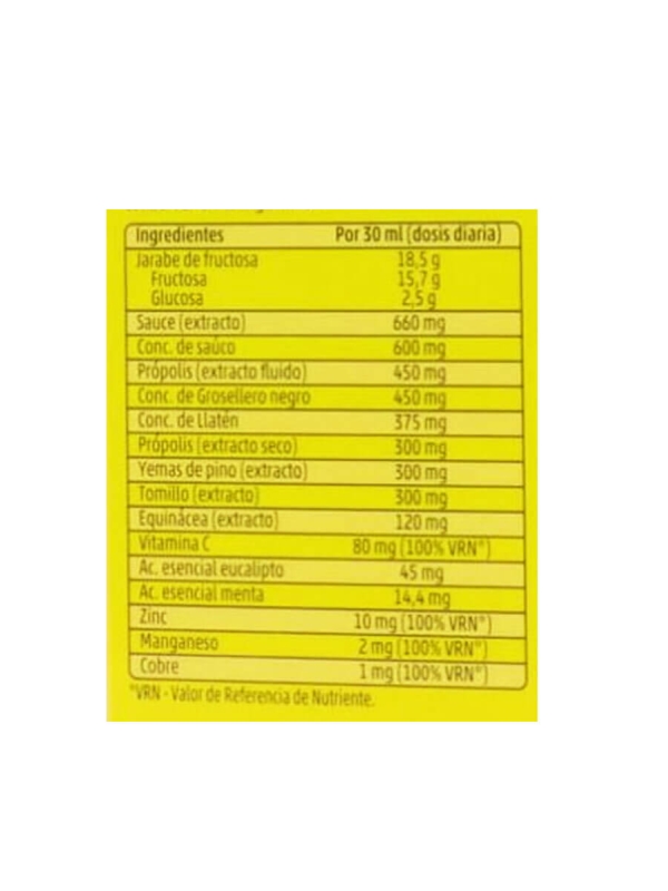 Extracto de própolis, zumo de grosellero negro (Ribes nigrum L., fruto), extracto de agrimonia (Agrimonia eupatoria L., sumidad florida), extracto de erísimo (Erysimum officinale L., parte aérea), aroma de regaliz.