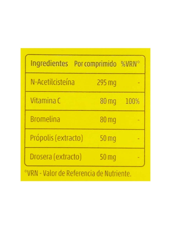 Ingredientes activos por comprimido efervescente: N-Acetilcisteína 295mg, Vitamina C 80mg (100% VRN*), Própolis 50mg, Extracto de Drosera (Drosera rotundifolia L., partes aéreas) 50mg y Serratiopeptidasa 30mg.