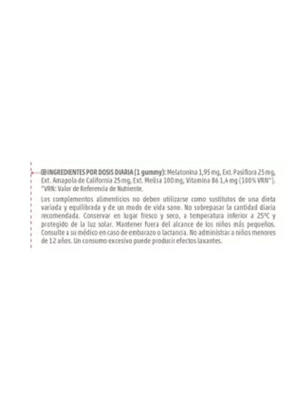 Edulcorante: maltitol, humectante: sorbitol, agua, extracto de melisa (Melissa officinalis L., hojas), gelificante: pectinas, acidulante: ácido citrico, extracto de Pasiflora (Passiflora incarnata L., partes aéreas), extracto de Amapola de California (Eschscholzia californica Cham, partes aéreas), corrector de la acidez: citratos de sodio, aceite vegetal (coco), aroma de arandano, vitamina B6 (clorhidrato de piridoxina), melotime™ (melatonina 1,95mg, agentes de recubrimiento: cera de carnauba, copolimero metacrilato, antiaglomerante: ácidos grasos, soporte: manitol), melatonina antiaglomerante: cera de carnauba, colorante: azul brillante FCF.