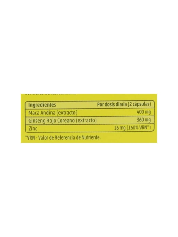 Por cápsula: Extracto de raíz (5:1) de Ginseng Rojo Coreano (Panax ginseng C.A. Meyer) 180 mg, equivalente a 900 mg. de polvo de raíz; Macapure, concentrado (5:1) de Maca andina (Lepidium meyenii Walp.), 200mg, equivalente a 1000 mg de polvo de raíz y Zinc, 5 mg (50% CDR*).