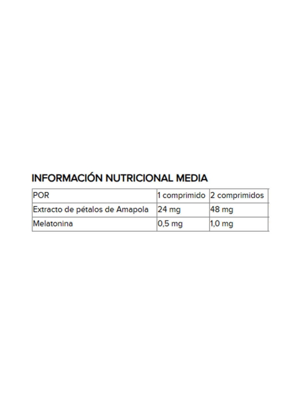 Agentes de carga: manitol, isomaltosa y almidón - Extracto de pétalos de Amapola (Papaver rhoeas L.) - Antiaglomerante: estearato de Magnesio - Aroma natural (sabor a Verbena) - Melatonina (0.5mg por comprimido).