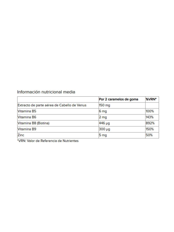 Jarabe de glucosa - Azúcar - Extracto de parte aérea de cabello de Venus (Adiantum capillus-veneris L.) - Acidificante: ácido cítrico, citrato de sodio - Gelificante: pectinas - Concentrado de flor de Cártamo (Carthamus tinctorius L.) y de rábano (Raphanus sativus L.) - Citrato de Zinc - Aroma natural - Vitamina B5 - Vitamina B6 - Vitamina B8 - Vitamina B9. Agente de recubrimiento: cera de carnauba.