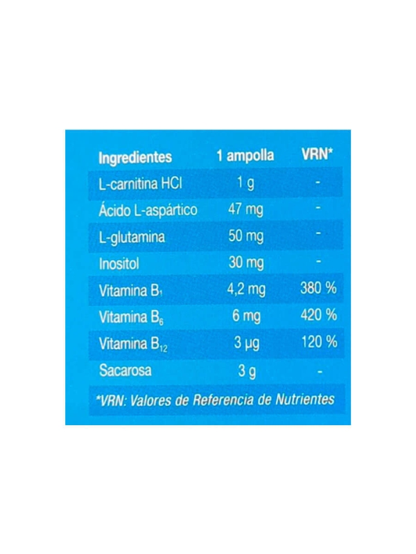 Agua; sacarosa; clorhidrato de L-carnitina; etanol; correctores de acidez: citrato de sodio e hidróxido de sodio; L-glutamina; ácido L-aspártico; aroma; inositol; conservador: sorbato de potasio; edulcorante: sacarina de sodio; conservador: benzoato de sodio; clorhidrato de piridoxina (vitamina B); mononitrato de tiamina (vitamina B.); cianocobalamina (vitamina B12). Sin gluten.