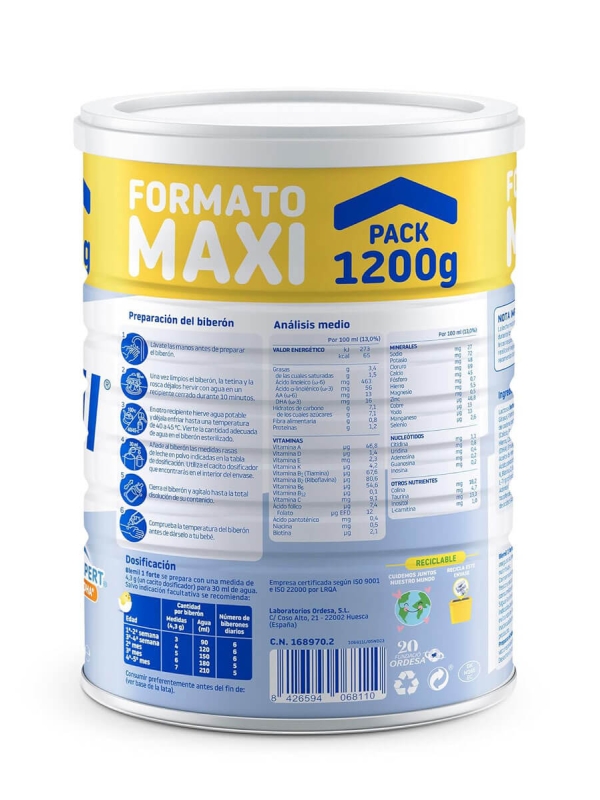 Leche desnatada, Lactosa, Aceites vegetales (Aceites de palma, palmiste, nabina, girasol, girasol alto oleico con ácido araquidónico (AA)), Fructooligosacáridos de cadena corta y cadena larga, Proteínas séricas enriquecidas en ?-lactoalbúmina, maltodextrina, Sales minerales de (Sodio, Potasio, Cloro, Calcio, Fósforo, Magnesio, Hierro, Cinc, Cobre, Manganeso, Yodo, Selenio), Emulgente (Lecitina de Soja), Aceite de pescado (fuente de DHA), Complejo vitamínico (Vitaminas: C, E, Nicotinamida, Pantotenato Cálcico, A, B6, B1, B2, Ácido fólico, K, Biotina, D, B12), Colina, Inositol, Taurina, Nucleótidos (Monofosfatos de: Citidina, Uridina Disódica, Adenosina, Inosina Disódica, Guanosina Disódica), Antioxidantes (Mezcla de Tocoferoles y Palmitato de Ascorbilo), L-Carnitina.