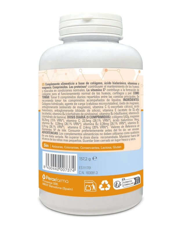 Es un complemento alimenticio formulado con colágeno hidrolizado que viene enriquecido principalmente por ácido hialurónico, magnesio y colágeno favoreciendo a los huesos, articulaciones, cartílagos y músculos, al tiempo que ayuda al aspecto sano de la piel. Además también contiene vitaminas como la del grupo B y C que disminuye la fatiga y poseen propiedades antioxidantes. Regula el sistema nervioso gracia a la síntesis de proteína que genera.