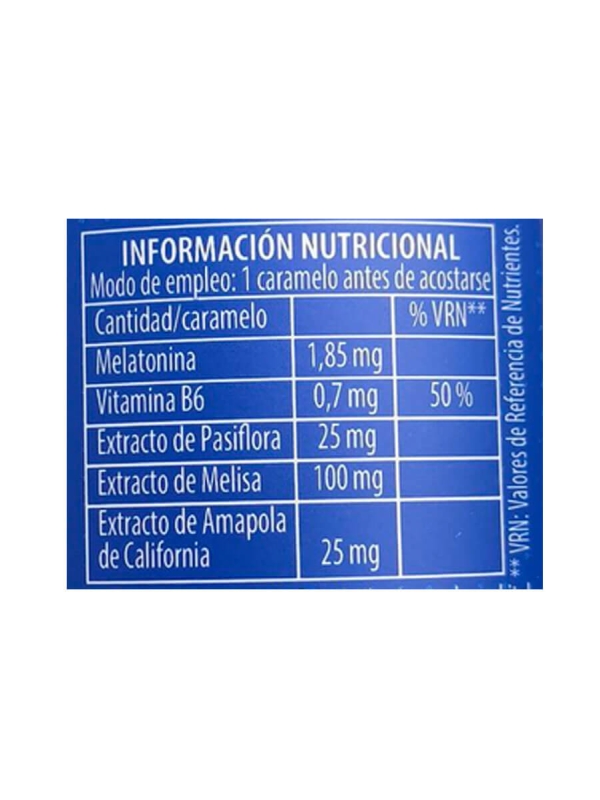Melatonina 1,85mg, Vitamina B6, Extracto de Pasiflora, Extracto de Melisa, Extracto de Amapola de California