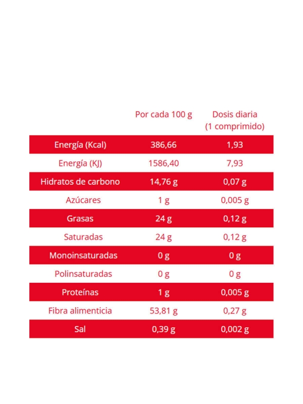 Agente de carga (celulosa microcristalina), gamma oryzanol, extracto seco de alcachofa (Cynara scolymus), estabilizante (carboximetilcelulosa sódica), policosanol, antiaglomerantes (dióxido de silicio, sales magnésicas de ácidos grasos), vitamina E (acetato de DL-alfa tocoferilo), vitamina B1 (clorhidrato de tiamina), picolinato de cromo.