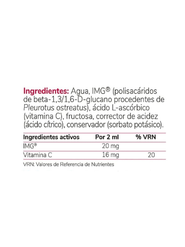 Agua, IMG - Imunoglukan(polisacaridos de beta-1,3/1,6-D-glucano procedentes de Pleurotus ostreatus), acido L-ascorbico( vitamina C), fructosa, corrector de acidez(acido citrico), conservator( sorbato potasico).