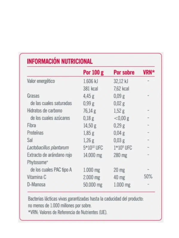 D-Manosa, extracto seco de arándanos Phytosome®, agentes de carga (maltodextrina, celulosa, microcistalina), Lactobacillus plantarum CECT 8675 y CECT 8677, aroma de limón, ácido L-ascórbico (vitamina C), agente antiadherente (dióxido de silicio), edulcorantes (sucralosa, sacarina sódica).