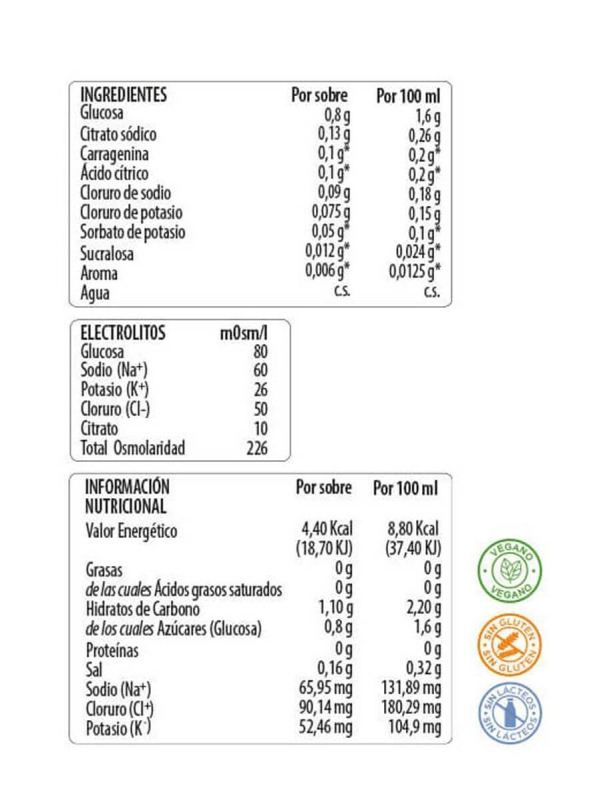 Agua desionizada, glucosa, citrato de sodio, gelificante (carragenina), acidificante (ácido cítrico), cloruro de sodio, cloruro de potasio, conservante (sorbato de potasio), edulcorante (sucralosa) y aroma.
