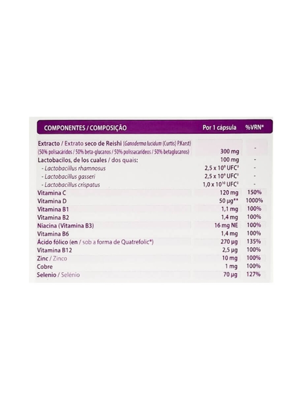 Extracto seco de Reishi, 15 mil millones de Lactobacillus por cápsula, de 3 cepas probióticas distintas (L. crispatus, L. rhamnosus y L. gasseri), Quatrefolic, vitaminas del grupo B, vitamina C, vitamina D, selenio, cobre y zinc.