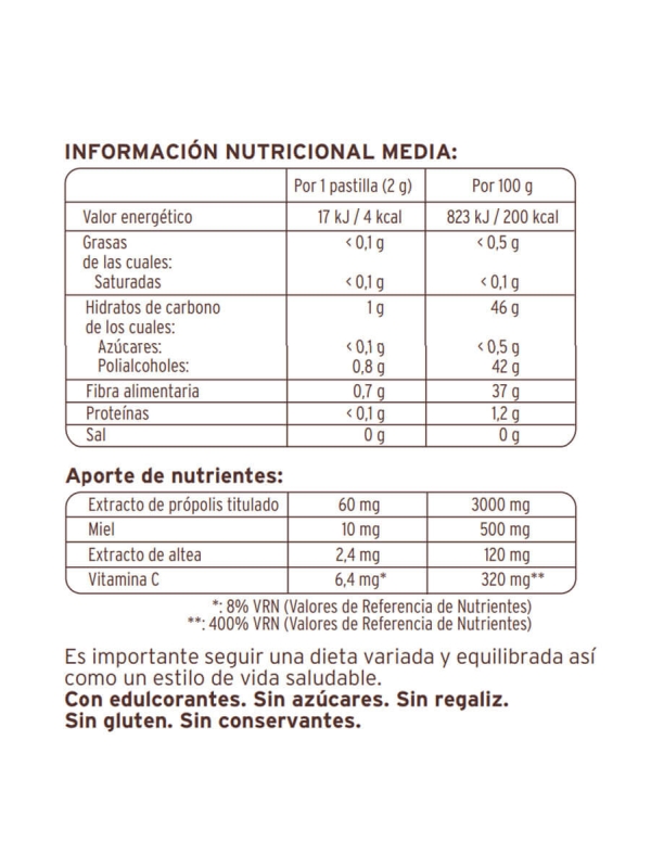 Estas pastillas suavizan la garganta gracias al efecto que producen al chuparlas en la mucosa bucofaríngea. Además, la Vitamina C que contiene posee propiedades anti-oxidativas y contribuye a reducir el cansancio y la fatiga. Por otro lado, el própolis tiene propiedades antisépticas y la altea contiene vitaminas del grupo B y vitamina A.