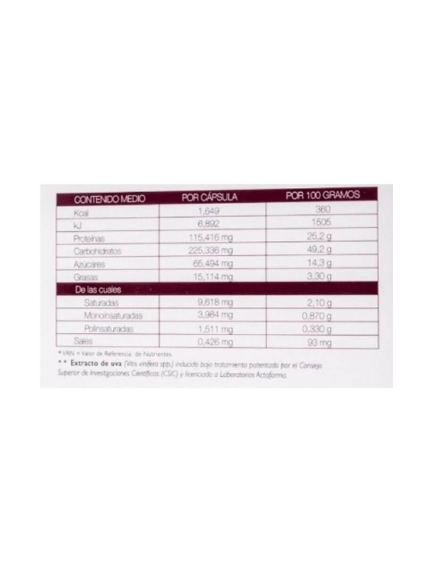 Extracto integral de uva rico en resveratrol, extracto seco de granada, levadura de selenio, vitamiana C, sulfato de Zinc y vitamina B12