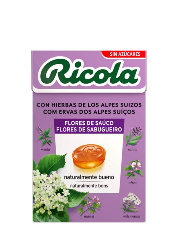 RICOLA caramelo de hiervas suizas y flores de sauco refrescan y cuidan la garganta.