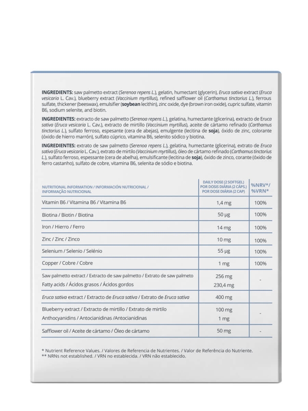Extracto de saw palmetto (serenoa repens L), gelatina, humectante (glicerina), extracto de eruca sativa (eruca vesicaria L Cav), extracto de mirtilo (vaccinium myrtillus), óleo de cártamo refinado (carthamus tinctorius L) sulfato ferroso, espesante (cera de abejas), emulgente (lecitina de soja), óxido de zinc, colorante (óxido de hierro marrón), sulfato cúprico, vitamina B6, selenito sódico y biotina.