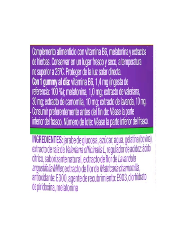 MELATONINA1 mg, Extracto de VALERIANA 30 mg, Extracto de CAMOMILA 10 mg, Extracto de LAVANDA 10 mg, Vitamina B6